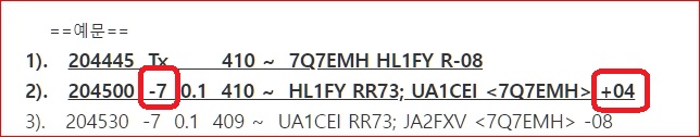 예문 2)번에서, -7은 현재 응답국이(HL1FY) 상대국의 신호를 수신한 리포트입니다(-7db).