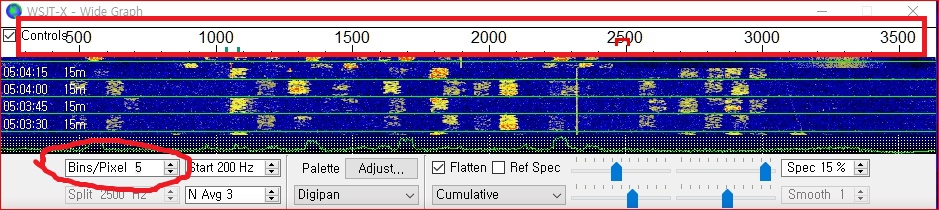 (사진 #5)▶ 워터폴 주파수 범위를 넓히려면, 왼쪽에 표시한 'Bins/Pixel' 의 숫자를 높이거나,