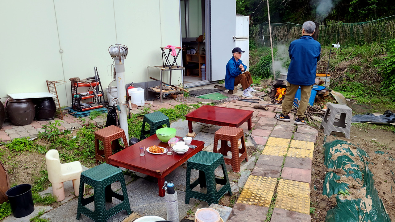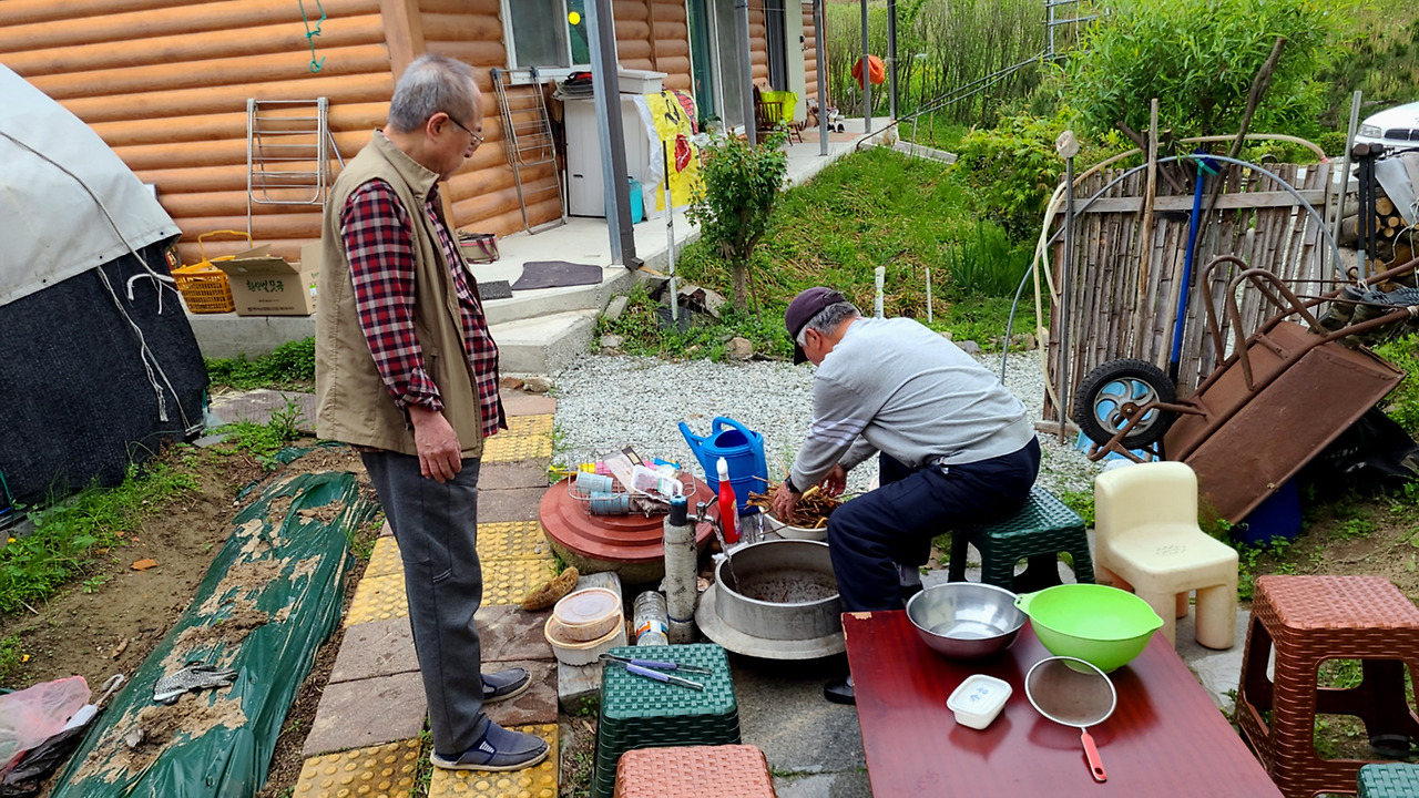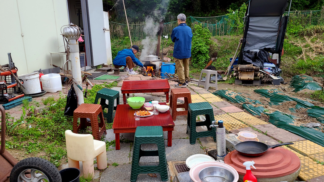 자칭, 영원한 화부 HL3EA님의 불 피우기와 각종 약재를 준비중인 HL2HI님과 HL3ZA님...