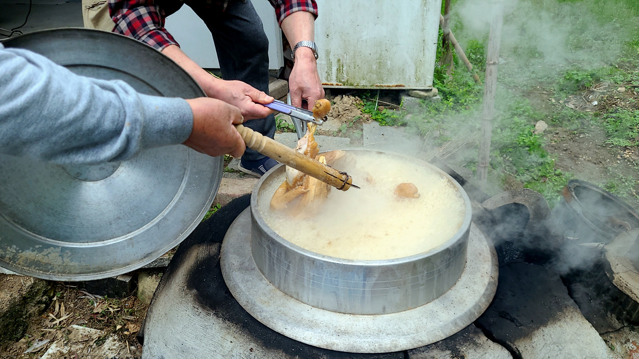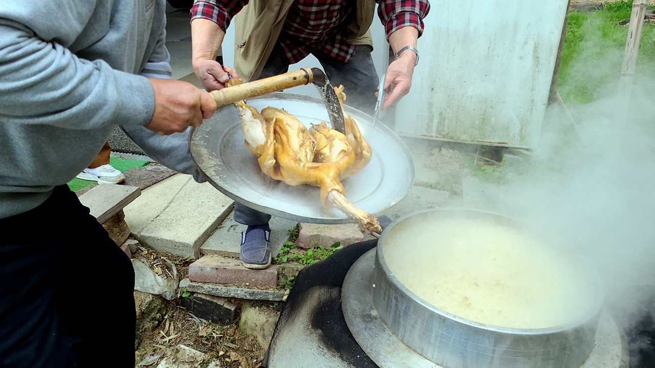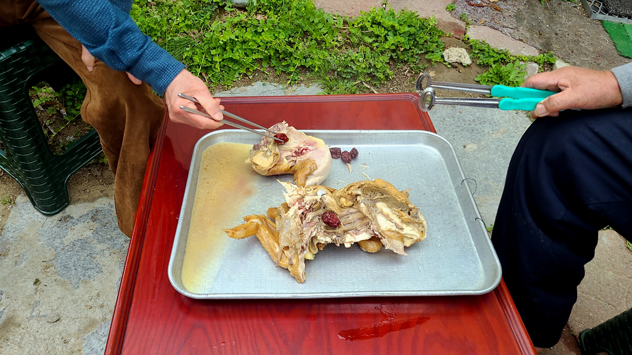 약재가 우러나 건져낸 약물에 전라의 토종 닭이 목욕(?)을 즐기는 시간...