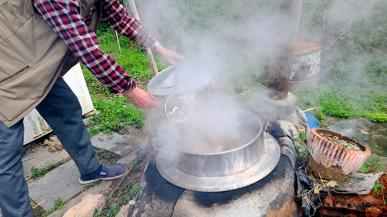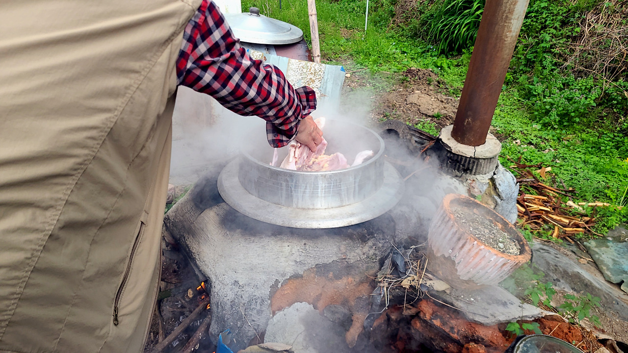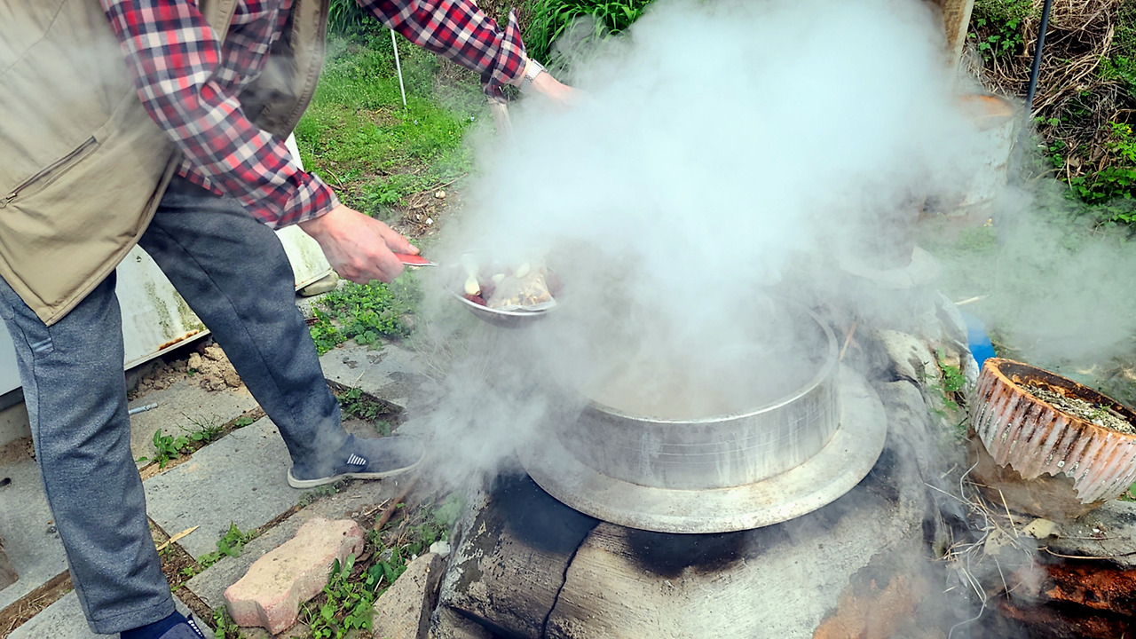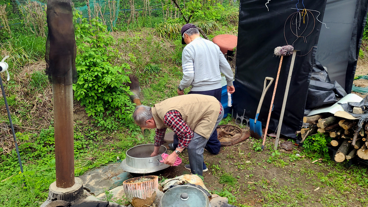 HL3ZA님의 부지런하고 노련한 솜씨로 가마솥을 씻고. 약재가 우선 씻어지고 삶아집니다...