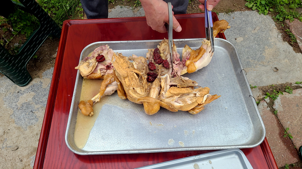 오리만큼이나 큰 토종닭이 익어가는 동안에 좌판이 펼쳐졌고...