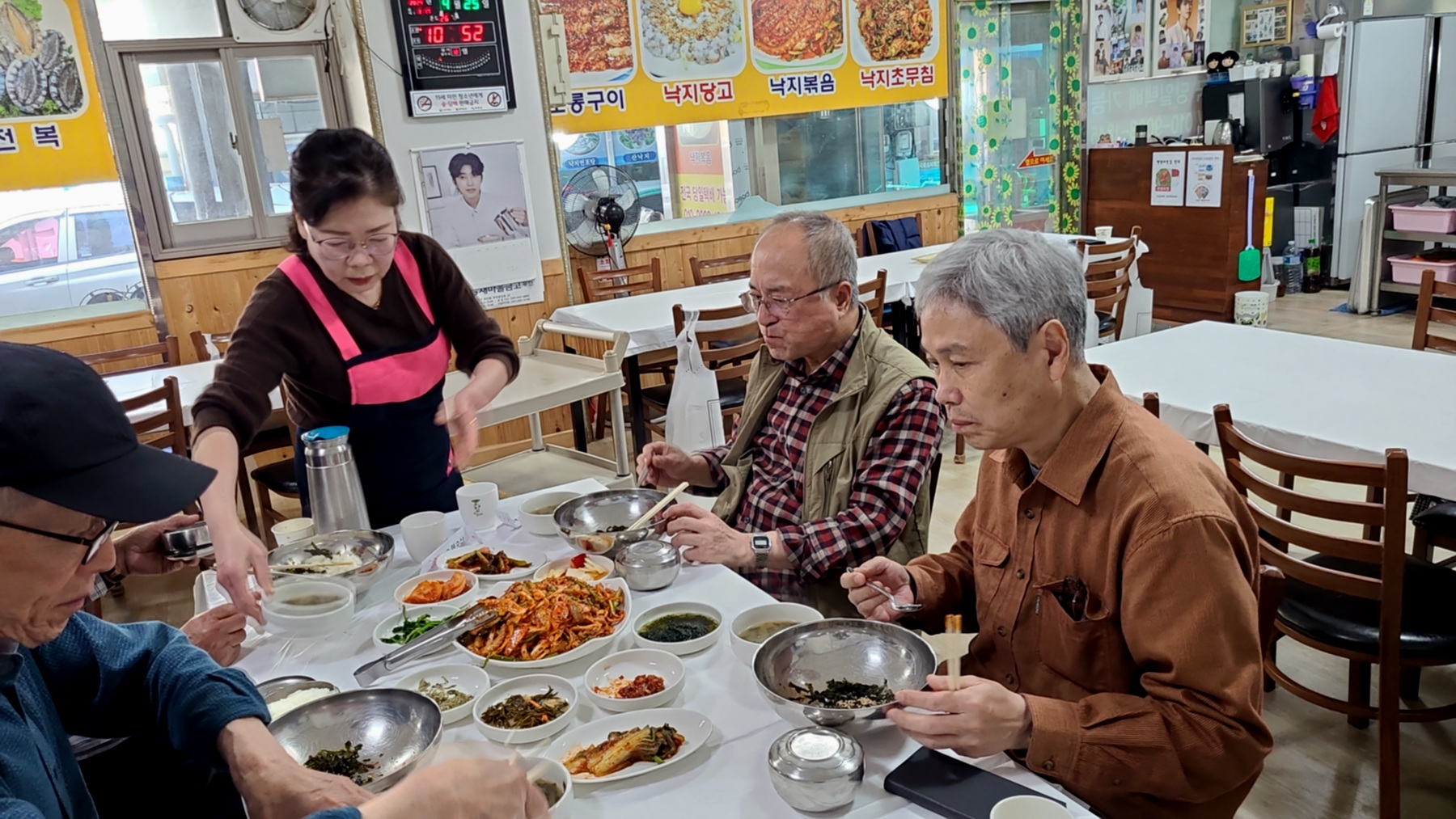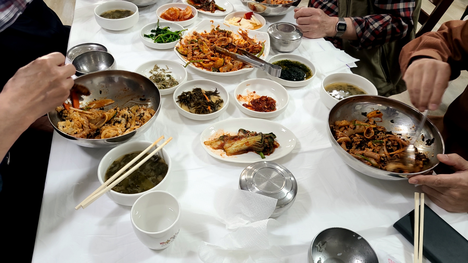 상위에 차려지는 비빔낙지와 각종 반찬들과 밥그릇...