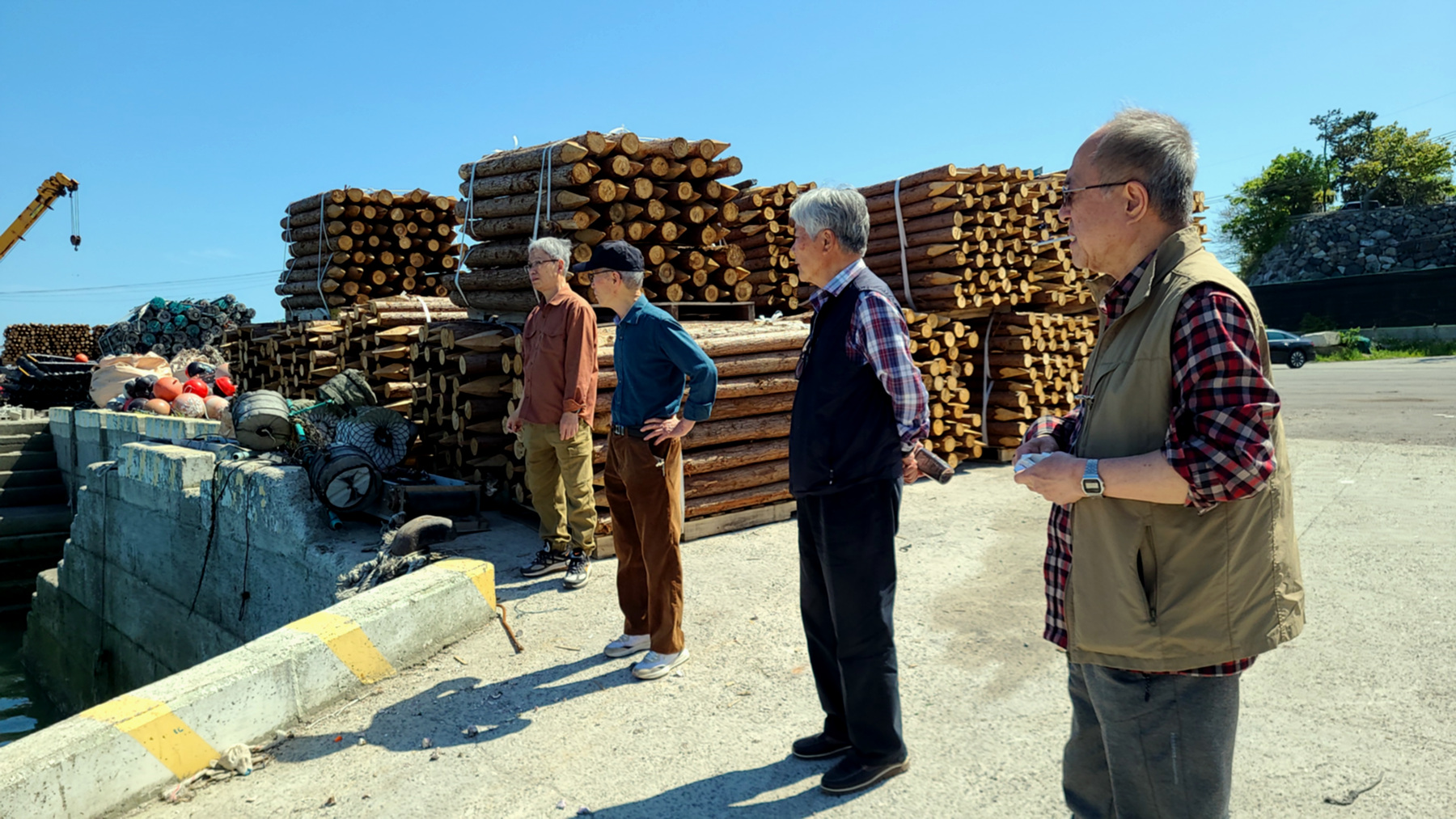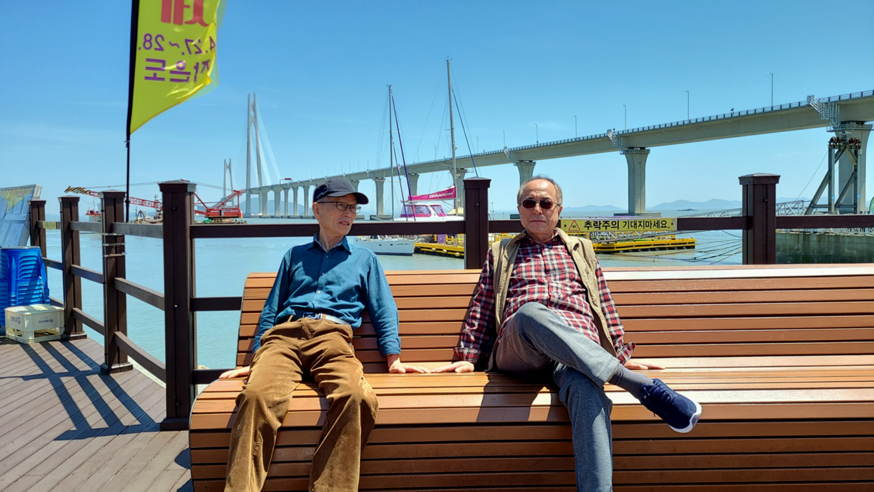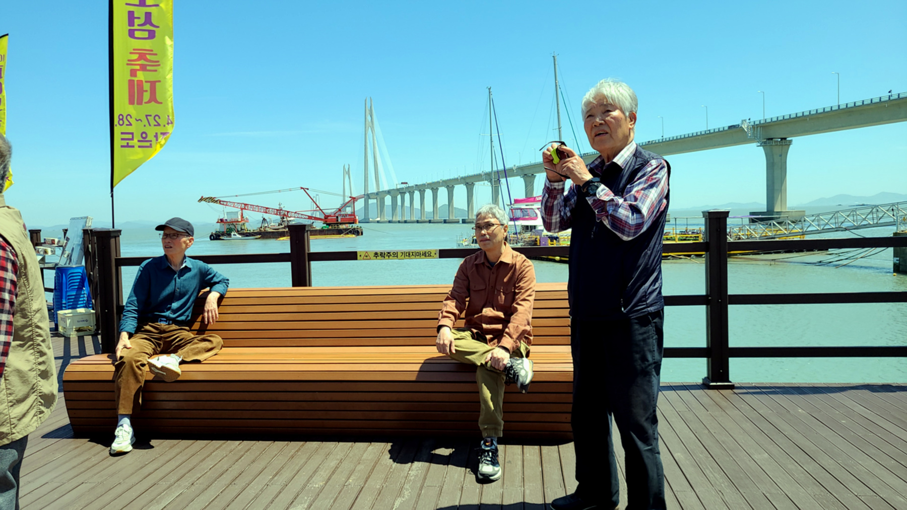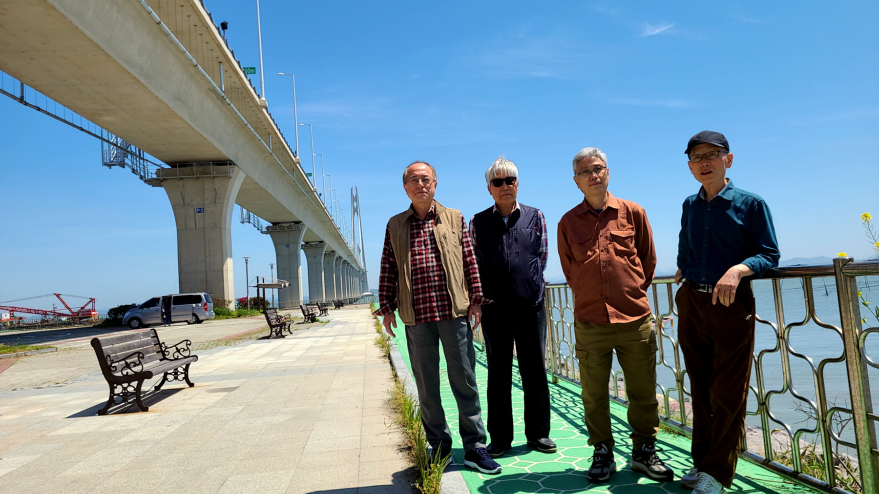 오도 선착장 대교종단 아래에서 잠시 몸을 풀고 대교를 배경으로 포즈를 취하며 인증샷을 남기는 일행....