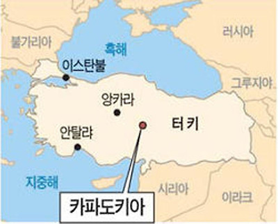 '카파도키아(Cappadocia, Kapadokya)'란페르시아어 '카트파두키아'에서 유래한 말로 '좋은 말들의 땅'이라는 뜻입니다.카파도키아는 지도에 나오는 도시명이 아니고,터키(Turkey)의 수도인 앙카라(Ankara)에서 남쪽으로 300Km 가량 떨어진 곳에 위치한아나톨리아(Anatolia) 고원의 남동부 일대를 말하는데,동쪽 카이세리(Kayseri) 부터 서쪽의 악사라이(Aksaray), 북쪽의 하치벡타쉬(Hacibektas),그리고 남쪽의 니그데(Nigde) 까지 매우 광할한 구역입니다. 아나톨리아 고원은 해발고도 800∼1200m인 분지형 고원으로동쪽으로 갈수록 고도가 높아져서결국 아르메니아(Armenia)고원으로 이어지는 매우 광대한 지역입니다. 카파도키아를 한마디로 표현하자면신이 만든 예술의 경지라고 극찬할 정도로 아름다운 곳입니다.