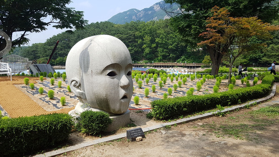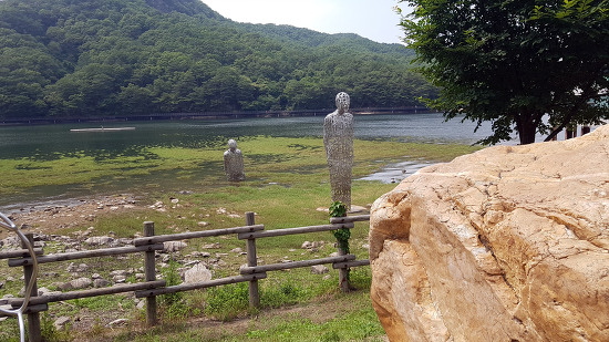 명성산을 배경으로 호수의 놀이터에 마련된 조각상과 조형물들...